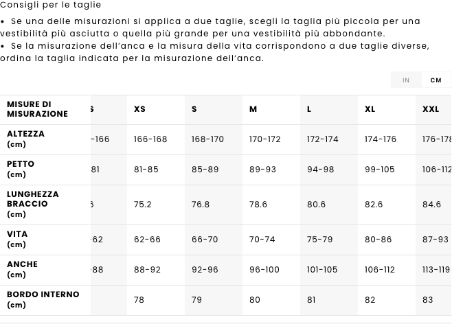 • Altre caratteristiche: sistema di aggancio giacca-pantaloni
